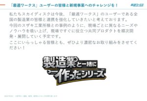 その後スカイディスク代表の内村より、最適ワークスについての現状と今後の展望、新プロダクトについてご案内。