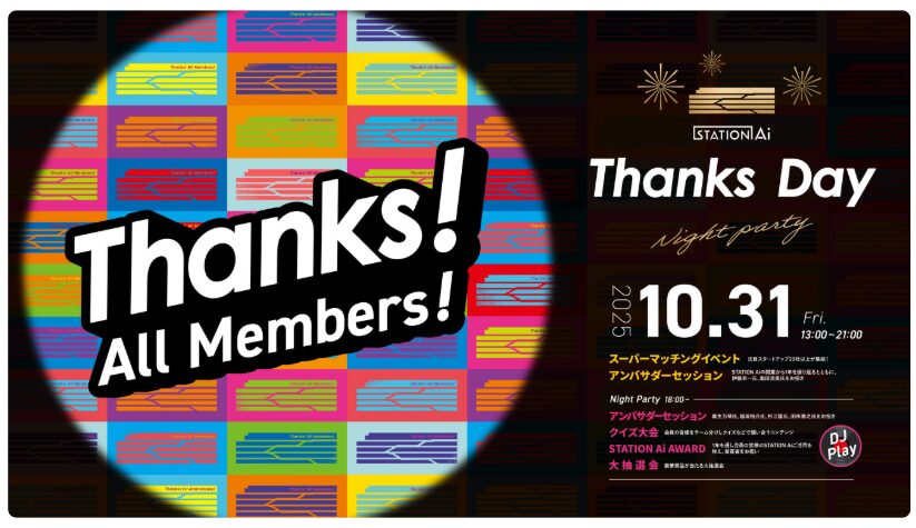 株式会社スカイディスク(本社:福岡県福岡市中央区、代表取締役CEO:内村 安里、以下「スカイディスク」)は、2025年10月31日(金)に開催される「STATION Ai Thanks Day」に参加いたします。本イベントは、日頃よりSTATION Aiを利用するメンバーへの感謝を込めて企画された、交流と学びの機会を提供する特別な1日です。