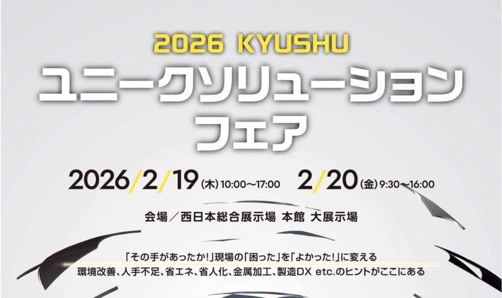 「2026 九州ユニークソリューションフェア」は、製造業を中心とした企業が抱える現場課題の解決を目的に、機械・設備・工具・DXソリューションなど多様な分野の最新技術・サービスが一堂に会する展示会です。会期中は、現場改善や業務効率化をテーマとしたセミナーも併せて開催されます。
