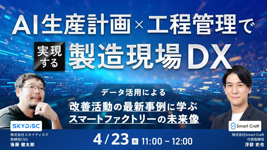 本セミナーは、AI生産スケジューラ「最適ワークス」を提供する株式会社スカイディスクと、クラウド工程管理・実績収集「Smart Craft」を提供する株式会社Smart Craftが共催し、生産計画と工程管理のデジタル化によってもたらされる製造現場の変革について解説します。